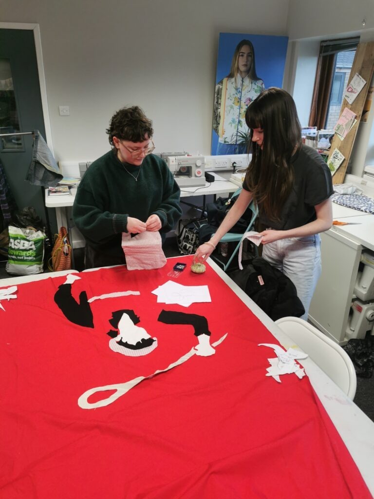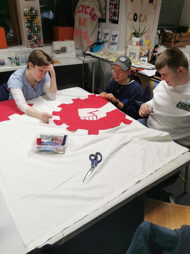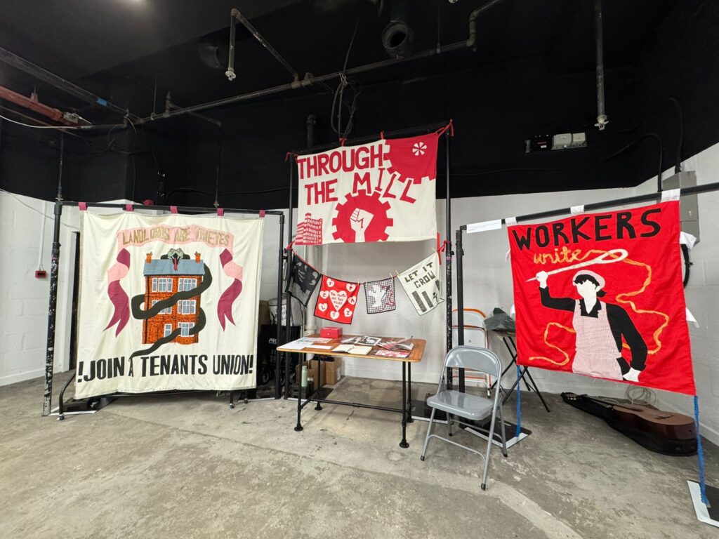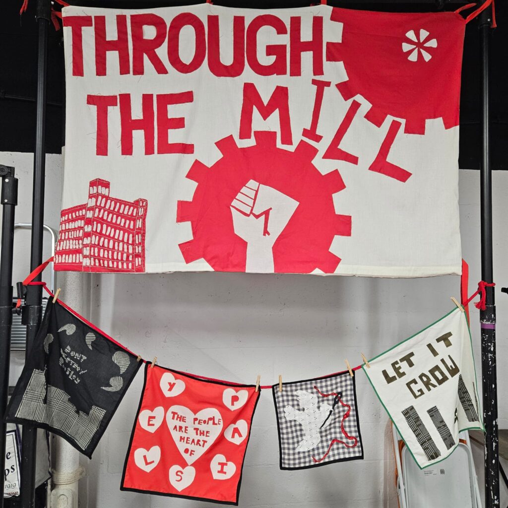 The works on display are newly created banners made by local participants in ReMode’s banner-making workshops. Drawing on the rich legacy of mill and weaving protests in Paisley, as well as present-day issues close to each maker’s heart, these banners represent a fusion of personal experience and collective memory. To learn more about ReMode’s heritage research into banners and Paisley’s protest history you can read our articles here: